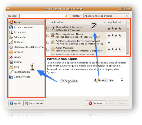 El programa Añadir/Quitar aplicaciones es la forma más sencilla en Ubuntu de instalar o quitar programas. También es la más limitada.