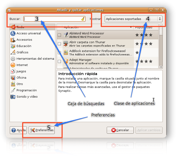 - El programa Añadir/Quitar aplicaciones. Una sencilla aplicación con la que podrás añadir o quitar paquetes de tu sistema de una manera muy sencilla.