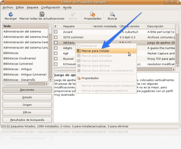 Para instalar un paquete puedes seleccionar una categoría, pulsar con el botón derecho en el paquete deseado y seleccionar “marcar para instalar” o hacer doble-click en el nombre del paquete.