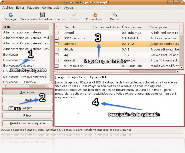 Las dos más importantes son la lista de categorías (1) en el lado izquierdo y la de los paquetes (3) en el lado derecho.