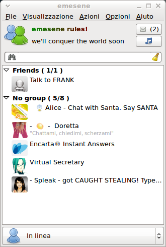 EMeSeNe es un cliente de mensajería instantánea multiplataforma desarrollada en Python + GTK. Es un "clon" de MSN Messenger que intenta tener una interfaz más simple y limpia que el cliente oficial. Es desarrollado por Luis Mariano Guerra y su licencia es GNU GPLv2. La nueva versión (1.0 beta) corre sobre el nuevo protocolo de Live Messenger (MSNP13), el cual permite integrar nuevas funcionalidades como mensajes offline, mensajes personales, etc.